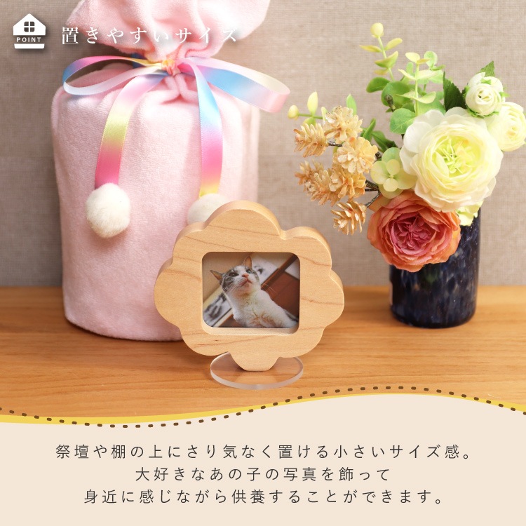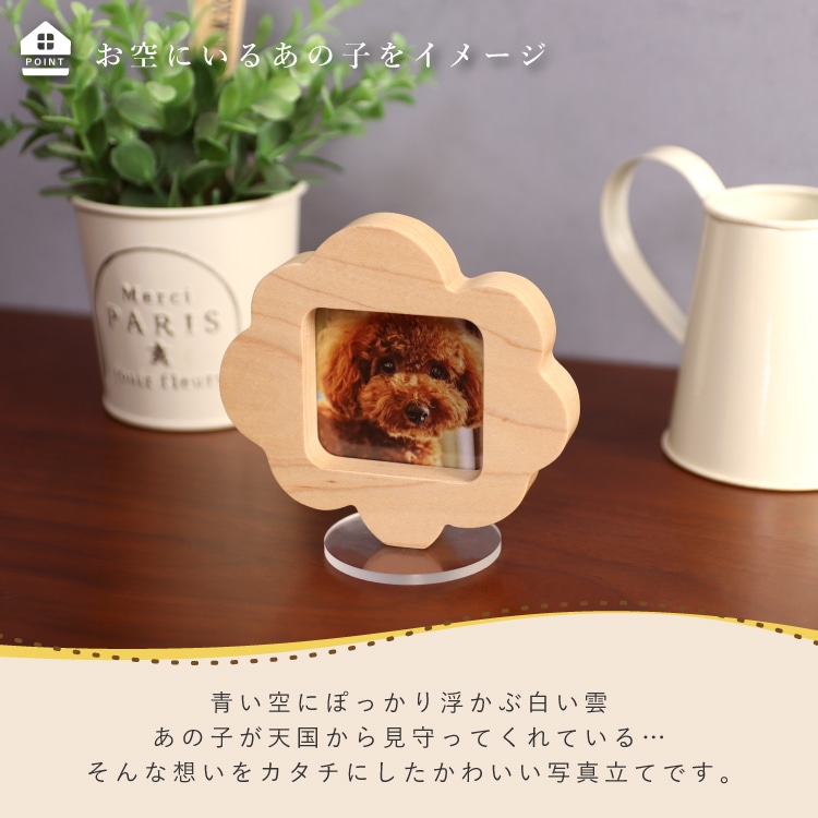 - 雲の形をしたかわいい写真立て。お気に入りの写真を飾って供養すれば、想い出が心によみがえります。仏壇や祭壇に置きやすいミニサイズで位牌や骨壺に合わせやすいシンプルなデザインです。北海道旭川の職人による丁寧な制作に天然木のあたたかみと優しさが感じられます。