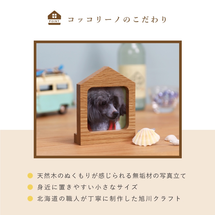 - 家の形をしたかわいい写真立て。お気に入りの写真を飾って供養すれば、想い出が心によみがえります。仏壇や祭壇に置きやすいミニサイズで位牌や骨壺に合わせやすいシンプルなデザインです。北海道旭川の職人による丁寧な制作に天然木のあたたかみと優しさが感じられます。
